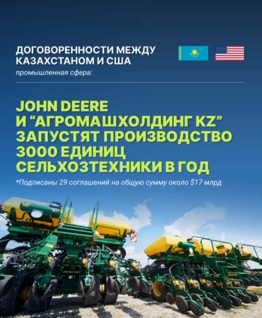 John Deere, «АгромашХолдинг KZ» АҚ және серіктестер арасында құны 2,5 миллиард доллар болатын стратегиялық келісімге қол қойылды.